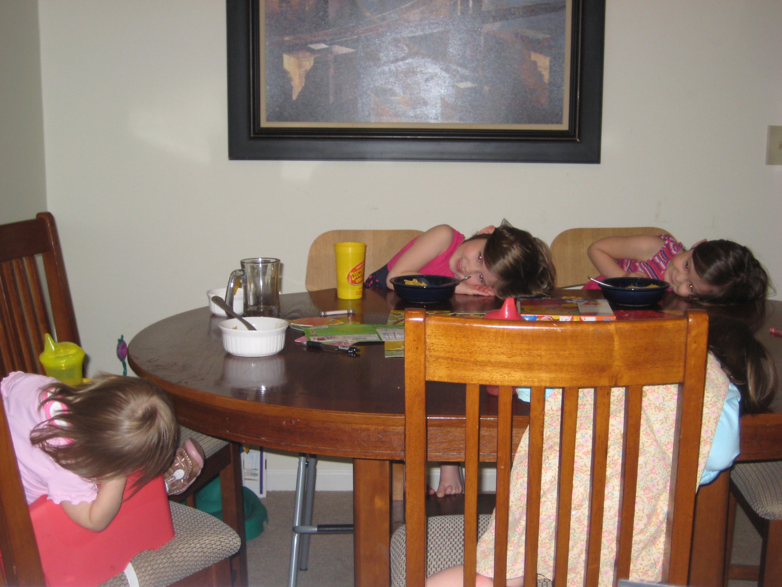 As I said before, the time change was not kind to us this week. During a late dinner on Tuesday night, I noticed Gracie and Sophia starting to put their heads on the table. As I took some dirty dishes into the kitchen, I jokingly said, “All right, everybody just go to sleep on the table,” then turned around to see this…
