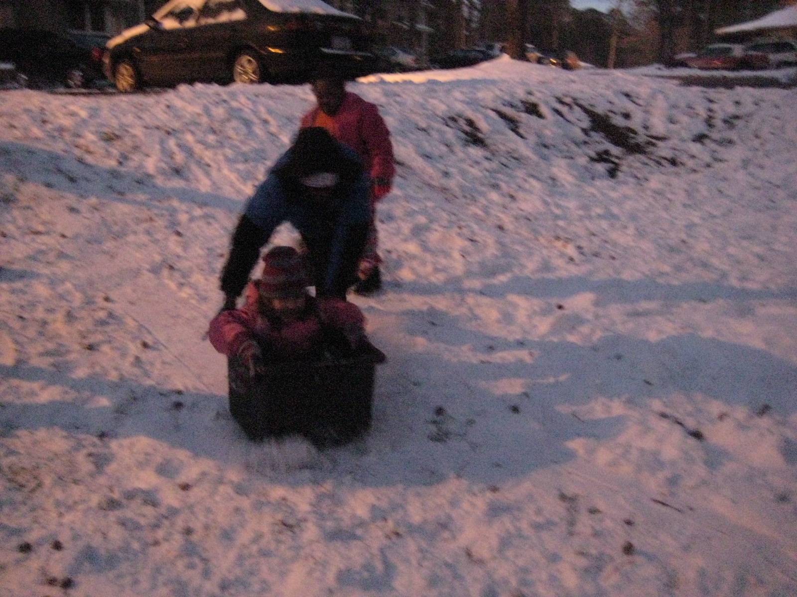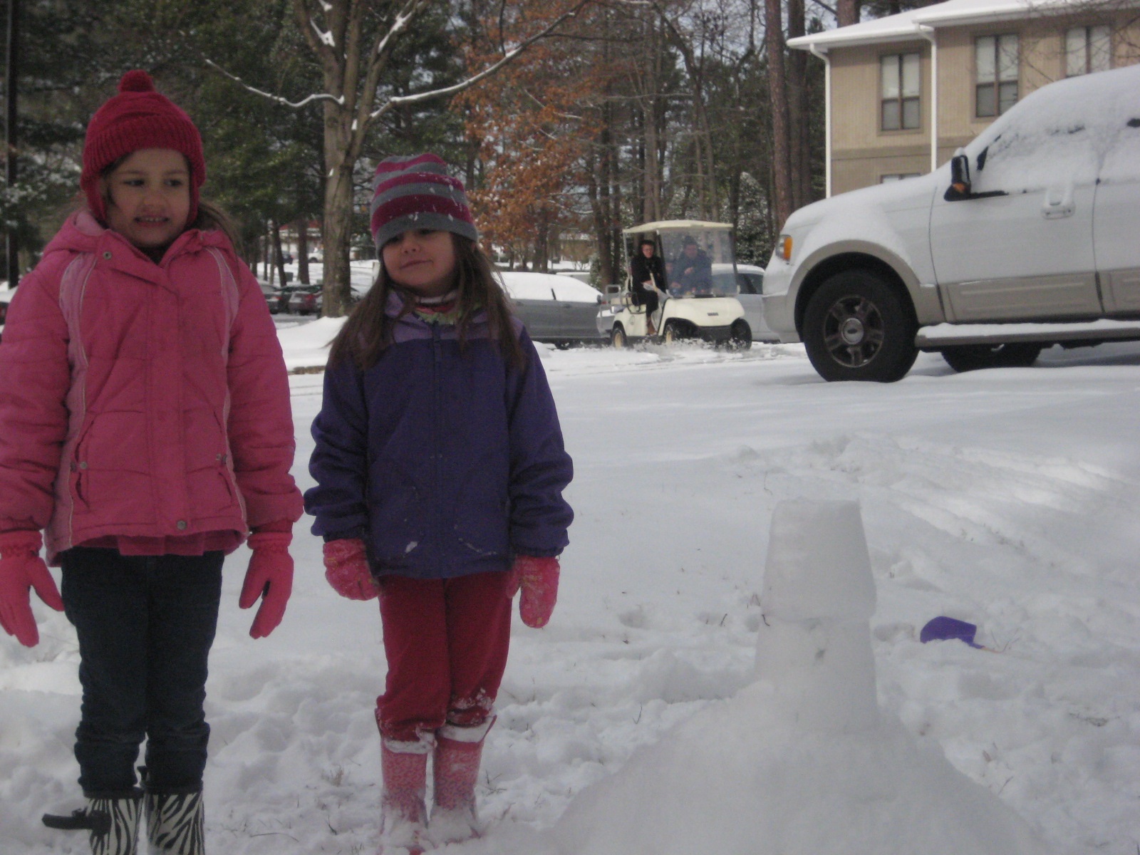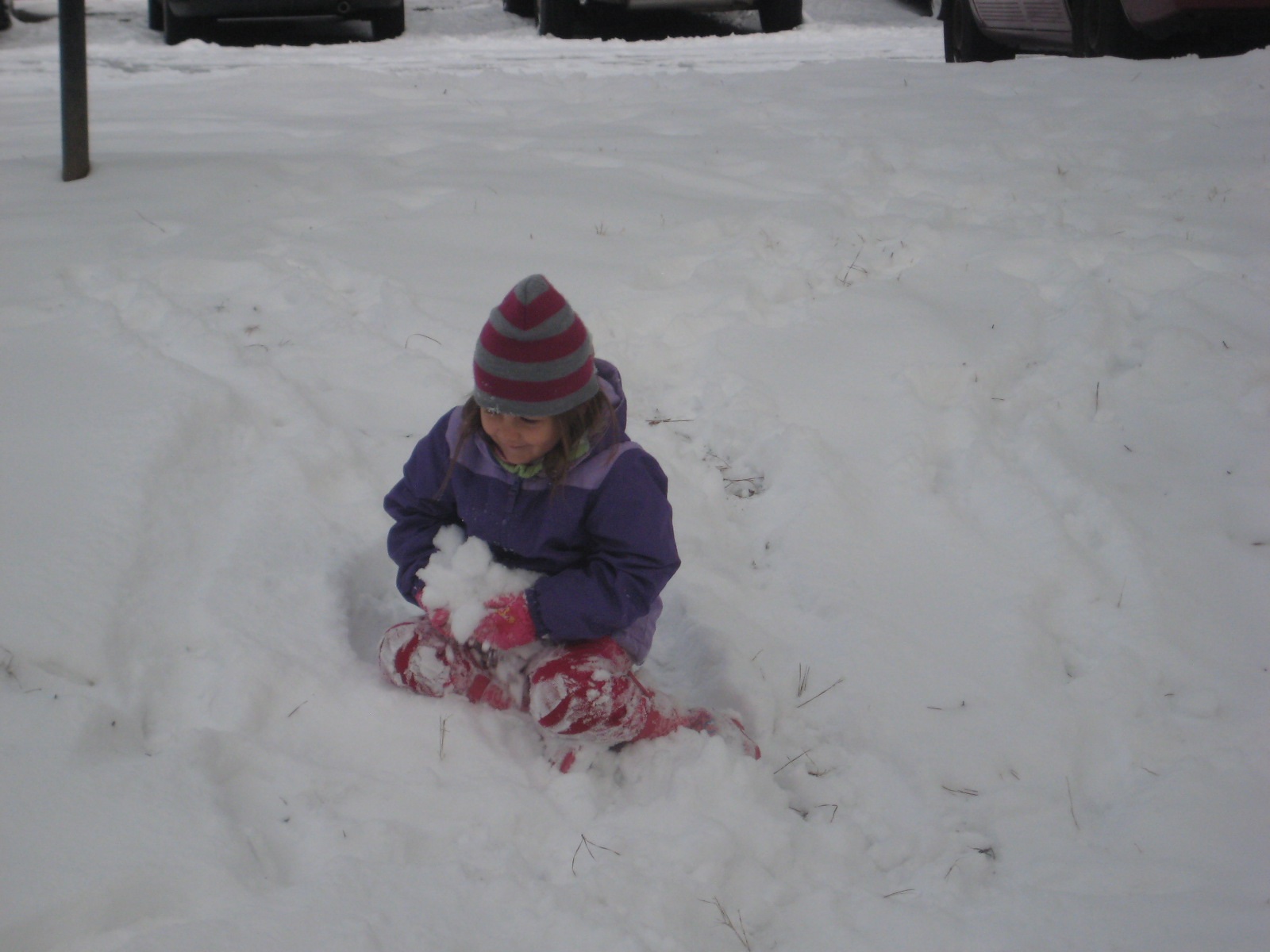 A few days after that initial play, we went out again. Some very sweet neighbor boys gave the girls rides in their tub and snowboard down the hill. How fun! And we built the smallest snowman known to mankind.