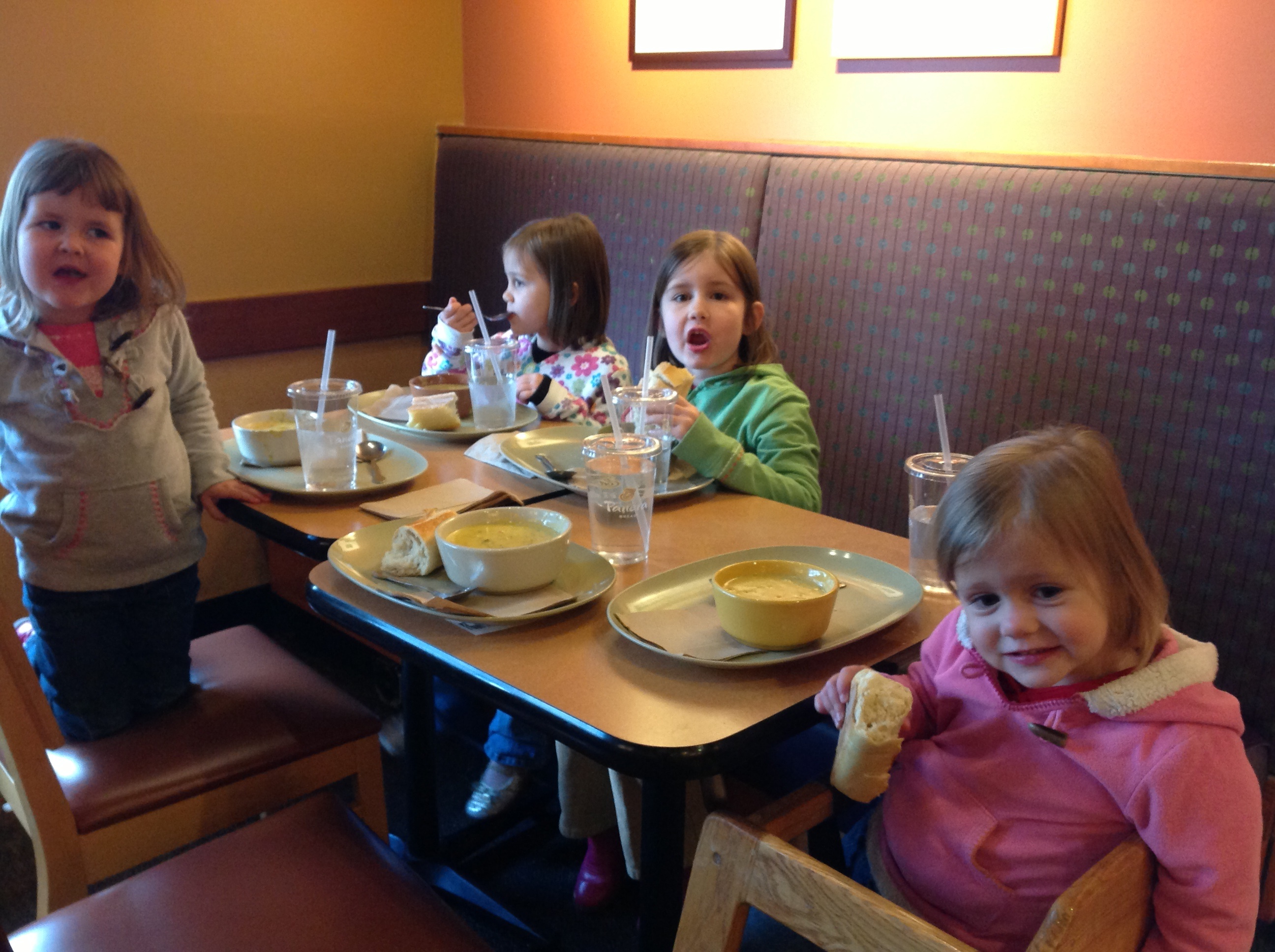 Broccoli cheese soup at Panera. Only Mckayla was skeptical, but the bread won her over and Mommy didn’t mind finishing hers.