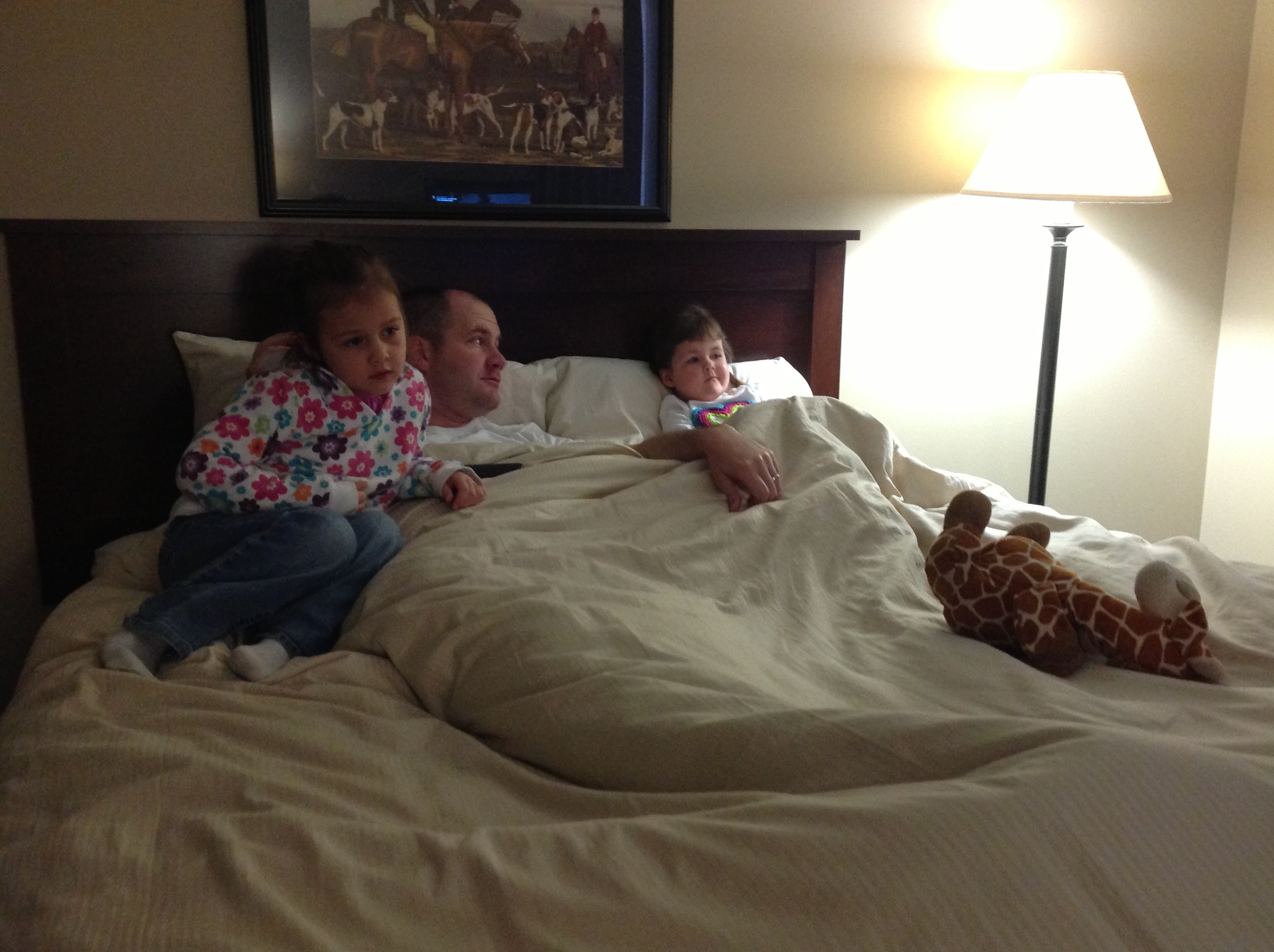 On the nights that Paul is home, I supervise/give the girls their baths and showers, get them all ready for bed, then send them out to tell Daddy, “I’m ready for bed!” Once they’re all ready, I make a final appearance in the living room to make sure that they have indeed let him know that everyone is ready for bed, because by that time I am quite ready for those lights to go out and that door to close.
